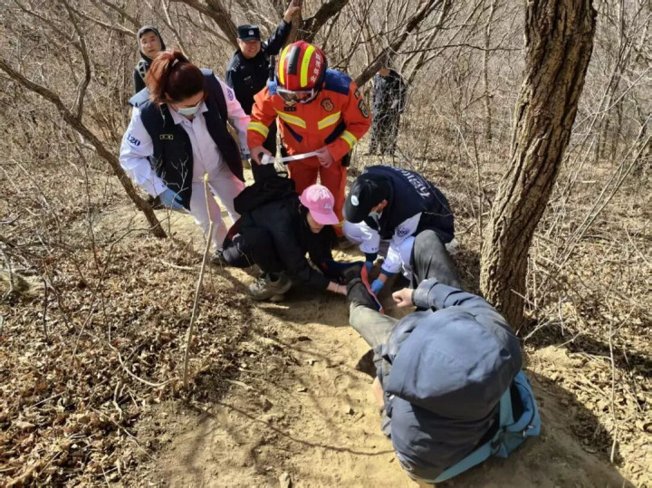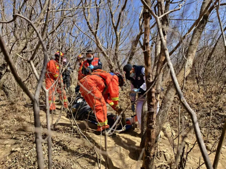 石景山支队陈家沟小型站接到指挥中心调度报警后,立即携带救援装备赶赴现场。救援人员徒步抵达被困地点,仔细查看伤者情况联合120医护人员以及民警,对受伤脚部进行简单固定处理,随后一路小心使用担架将受伤人员护送下山。途中,救援人员时刻留意路面状况,平稳护送伤者安全抵达山下。